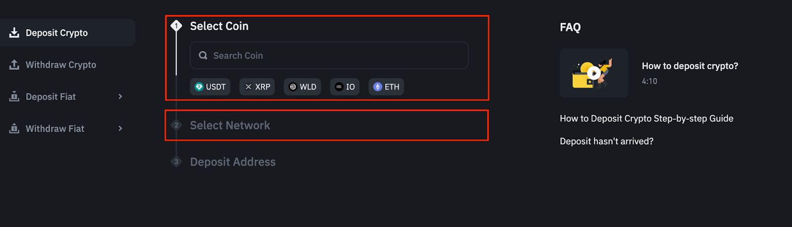 1. 访问您的币安账户,点击【充值】,然后选择【充值加密货币】。